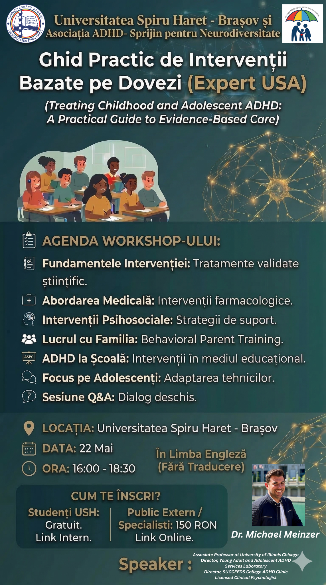 Workshop-ul va fi susținut de Dr. Michael Meinzer, expert de renume din Statele Unite ale Americii (University of Illinois Chicago), oferind o perspectivă modernă și aplicată asupra tratamentului ADHD la copii și adolescenți.