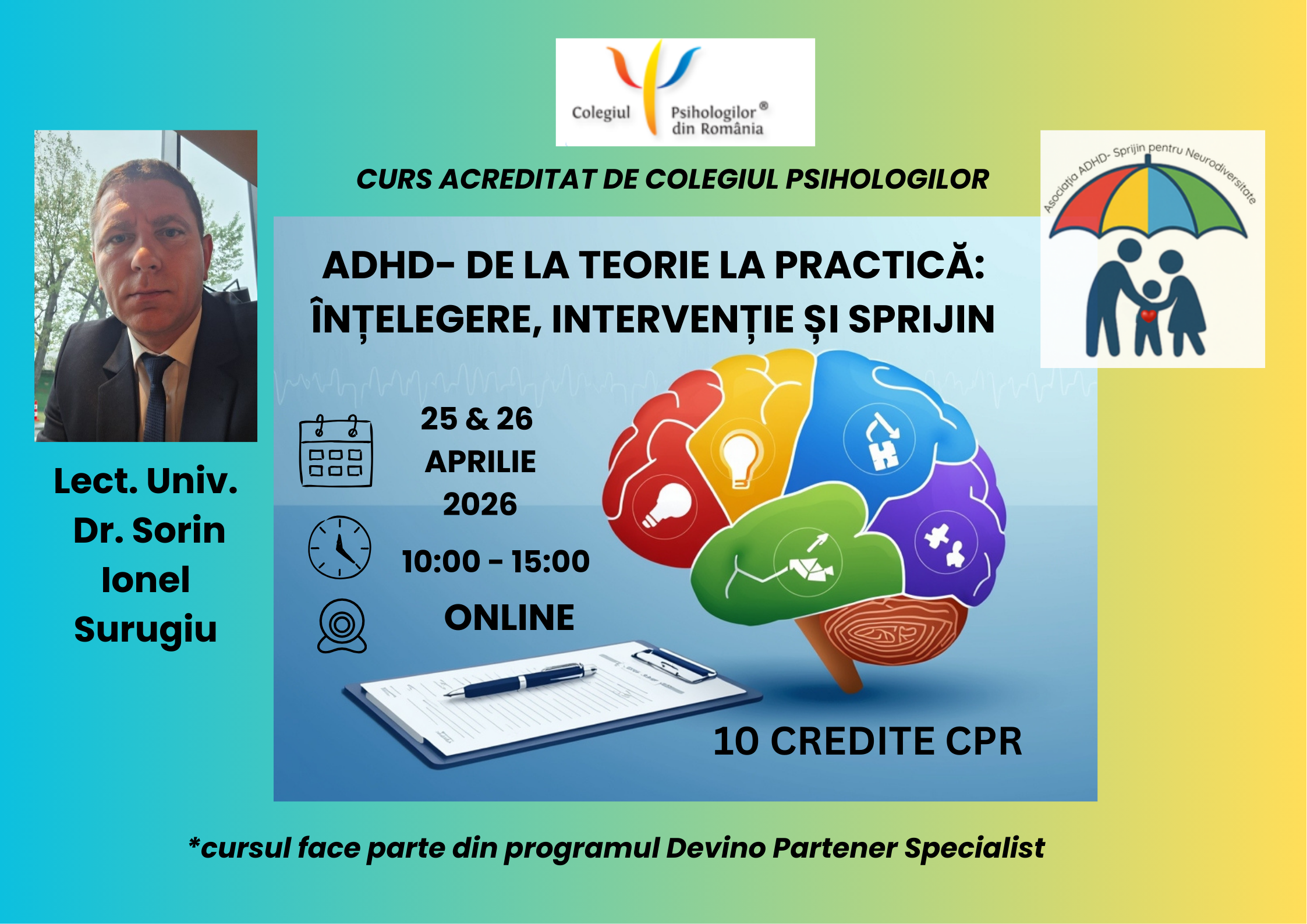 Vrei să aprofundezi ADHD-ul dintr-o perspectivă științifică actuală și să dobândești instrumente practice, aplicabile imediat în activitatea ta profesională?